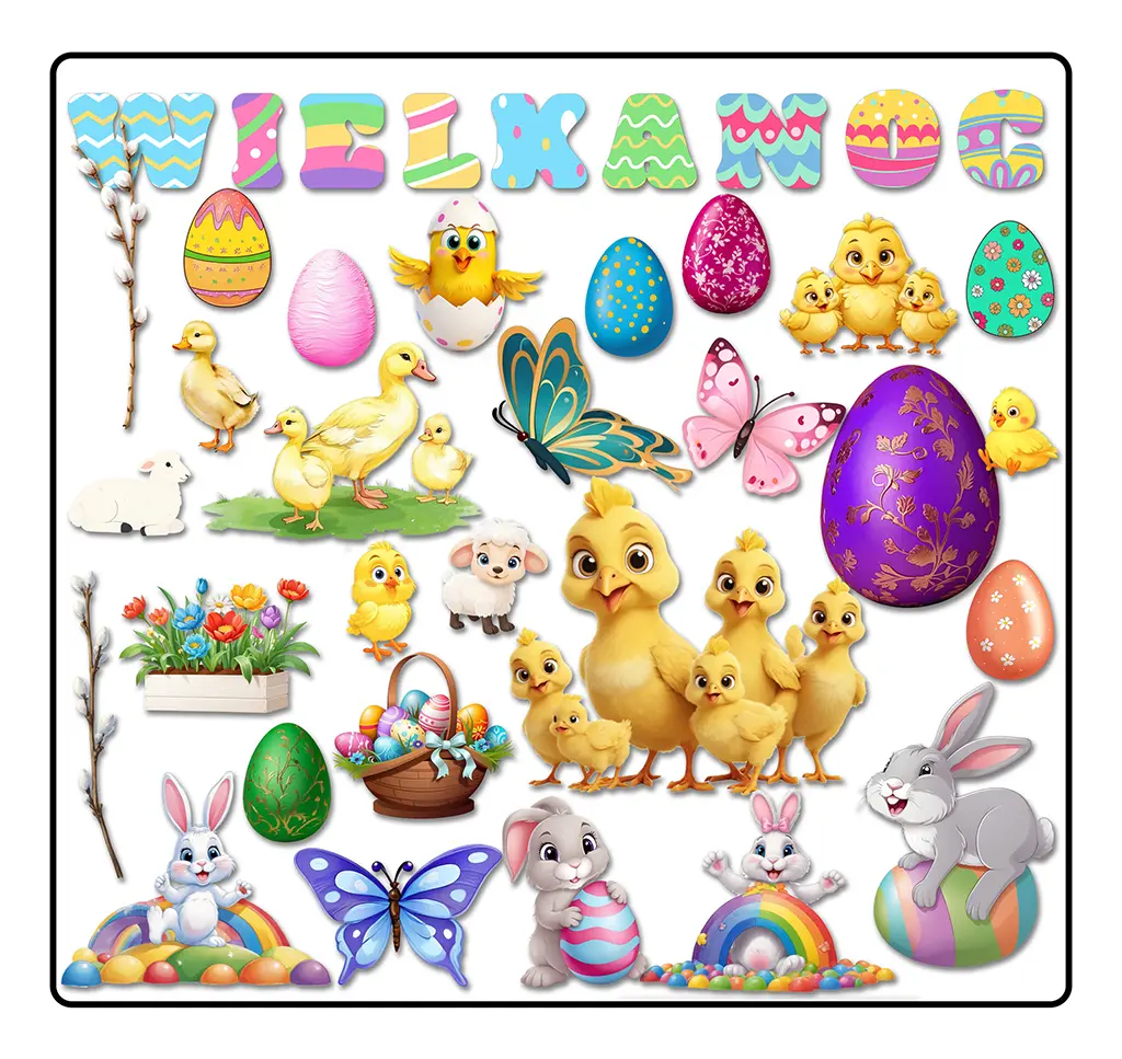 - Zawartość: Litery “WIELKANOC” (pisanki), kurczaczki, zajączki, pisanki, motyle, bazie, kaczuszki, owieczki.