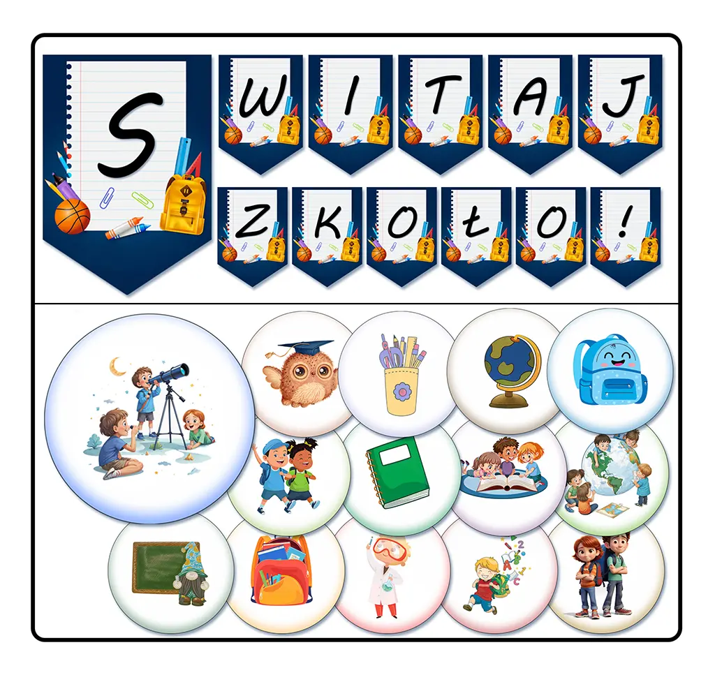 • Zawartość: Litery dekoracyjne “WITAJ SZKOŁO”, grafiki szkolne wkomponowane w litery, zestaw okrągłych symboli szkolnych.
