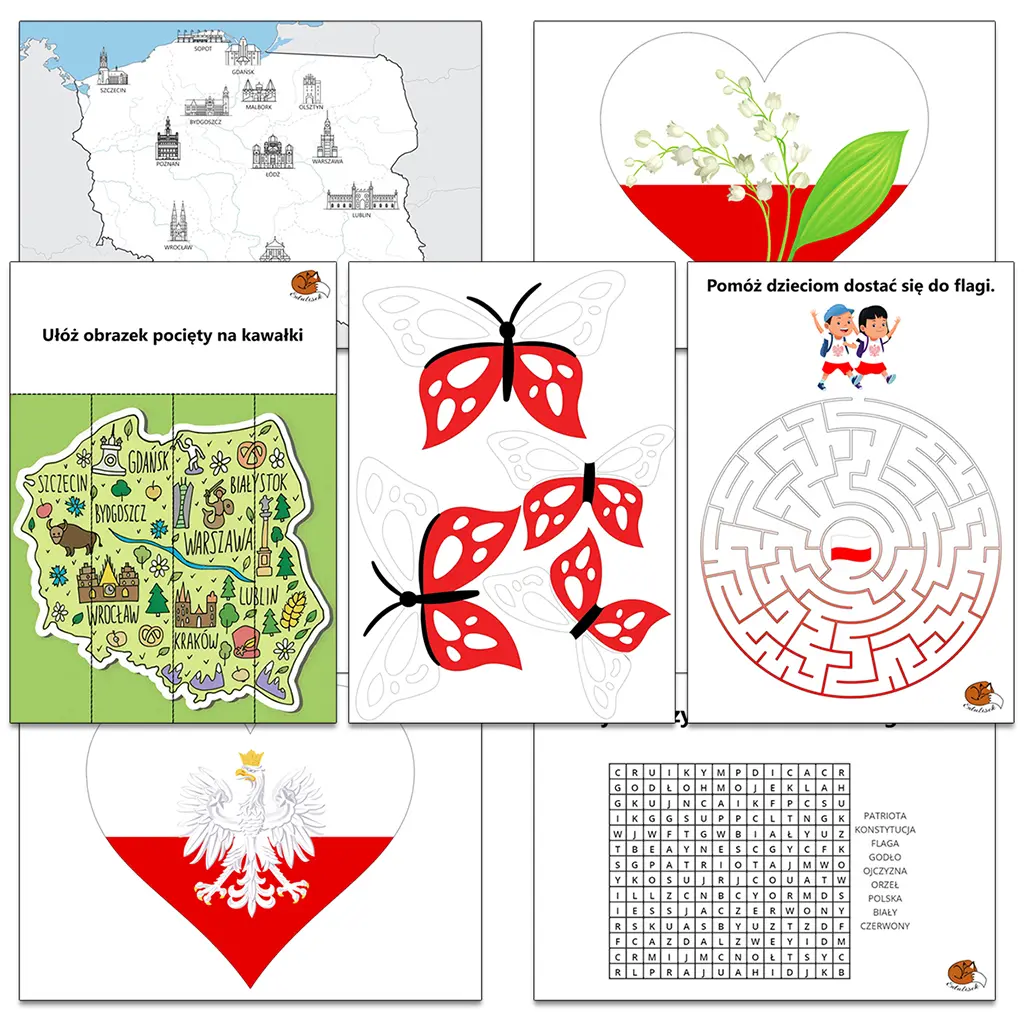 Pakiet łączy duże elementy dekoracyjne z angażującymi kartami pracy, które rozwijają wiedzę historyczną i patriotyczną w przyjazny dla dzieci sposób.