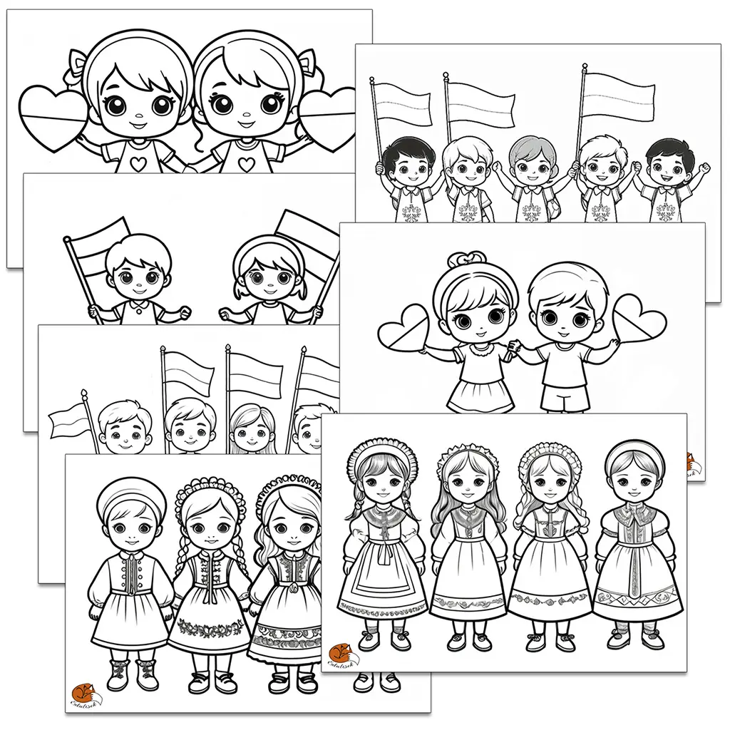 - Kolorowanki: Duży wybór grafik do kolorowania, przedstawiających m.in. dzieci w strojach ludowych i dzieci z polskimi flagami.
