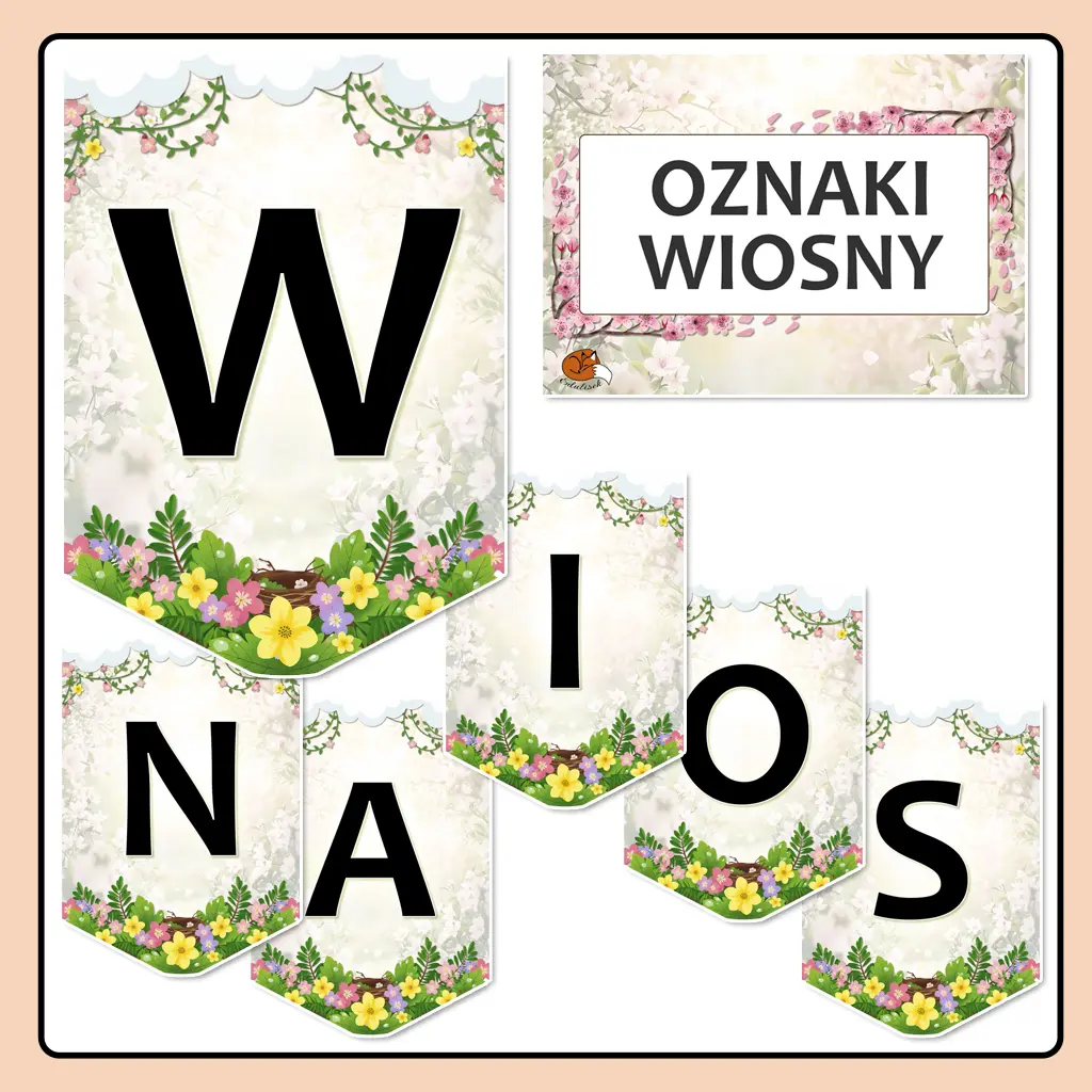 Napis girlanda „WIOSNA” – duże, ozdobne litery w wiosennej oprawie graficznej (kwiaty, zieleń), idealne do powieszenia nad tablicą lub na oknie.