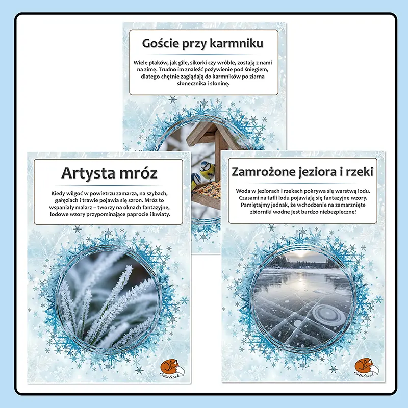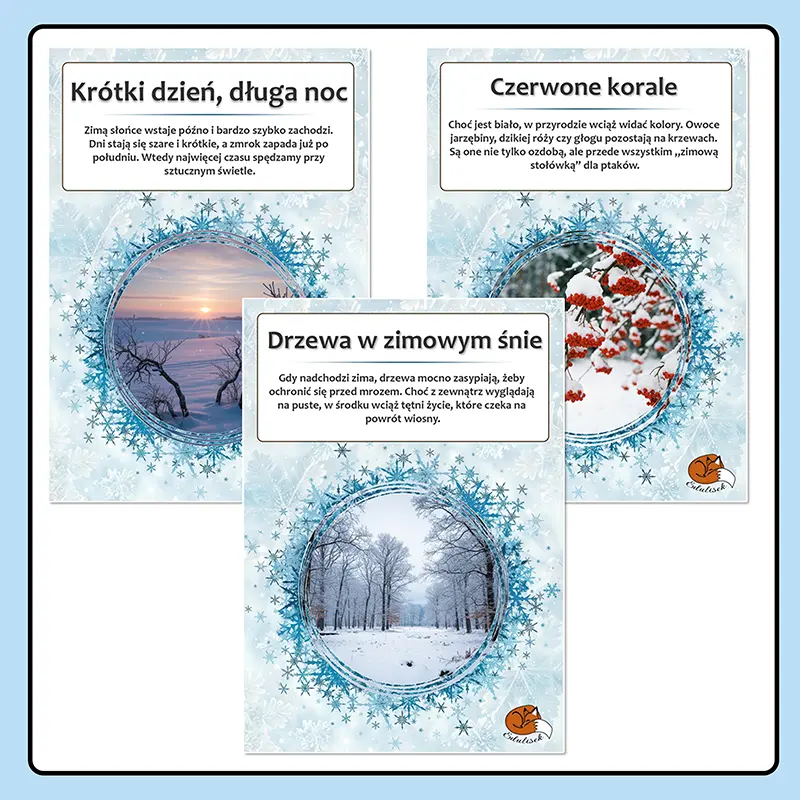 12 kart obrazkowych z opisami, które w przystępny sposób przedstawiają najważniejsze zmiany zachodzące zimą w przyrodzie i w życiu człowieka.