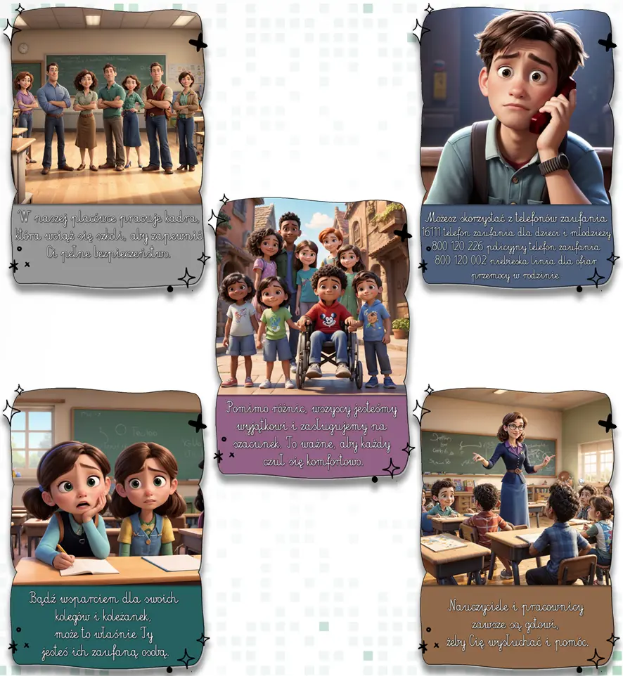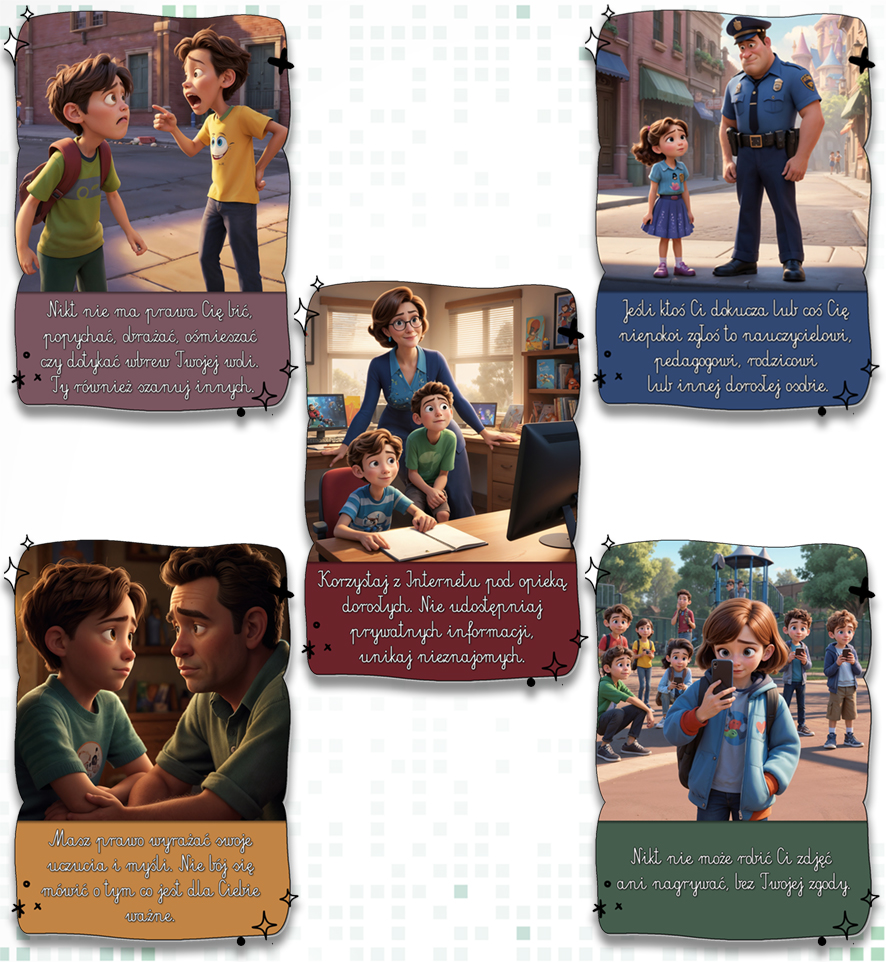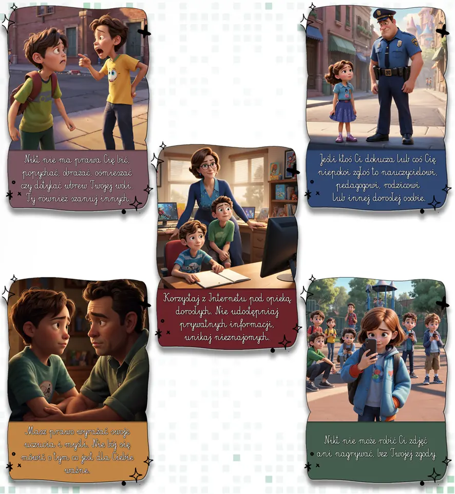 • Informacje o ich prawach, bezpiecznych relacjach i procedurach reagowania.